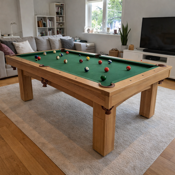 Stół bilardowy Hektor to prawdziwy majstersztyk wykonany z litego drewna, łączący w sobie klasyczny styl i nowoczesne rozwiązania. Ten elegancki stół oferuje wybór sukna bilardowego w czterech standardowych kolorach lub opcję wyboru sukna firmy Simonis, dostępnego w około 30 odcieniach. Solidne, regulowane stopki do wysokości 10 cm i śruby regulacyjne do poziomowania płyty rozgrywającej gwarantują stabilność i idealne dopasowanie stołu do każdej powierzchni. Hektor wyposażony jest w płytę kamienną dla profesjonalnych graczy oraz płytę postformingową, idealną dla amatorów. Dodatkowo, można wybrać między łuzami i koszami winylowymi a koszami wykończonymi skórą, co dodaje mu luksusowego charakteru.